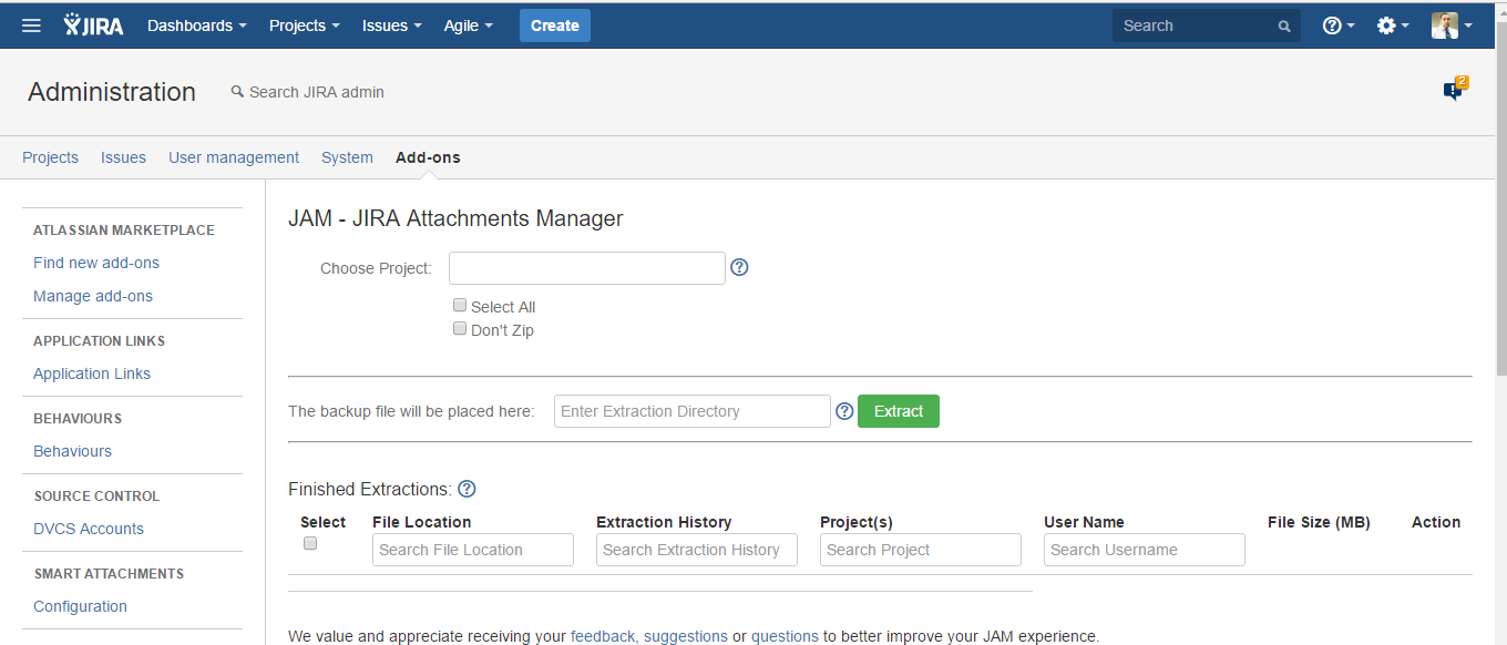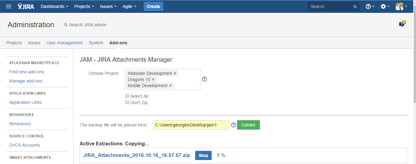 From here, you need to select your project(s), whether or not choose if you want to zip/unzip your extraction and a valid path on the server where JIRA is installed. Once you have filled the needed informations, you have to simply click on the "Extract" button. Now JAM will start extracting and collecting all the attachments of the selected projects. The extraction time depends on the size of the attachments and the server specs.