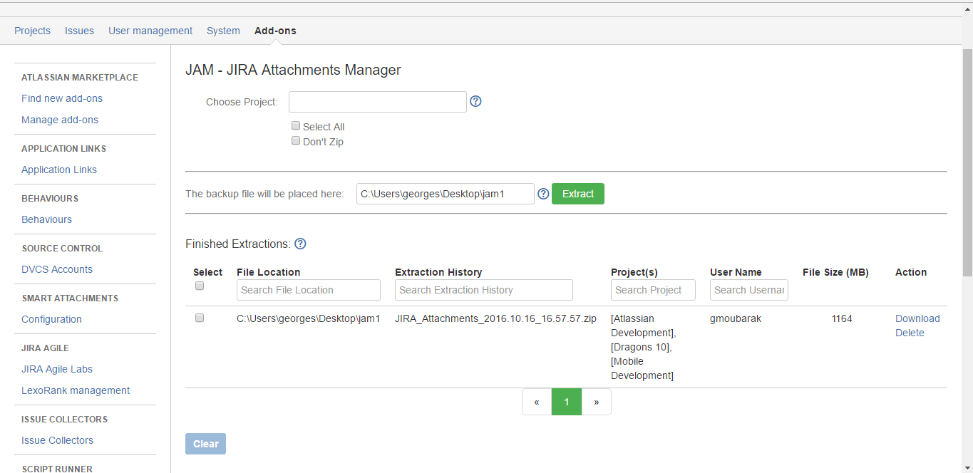 As you can see in the previous screenshot, that once the extraction is done, a new record is added in the history. You will see it's physical location on the server, name, the selected projects in that operation, the user who has triggered it and the size of the file. You will be able also to either download the file locally or simply delete it from the system.