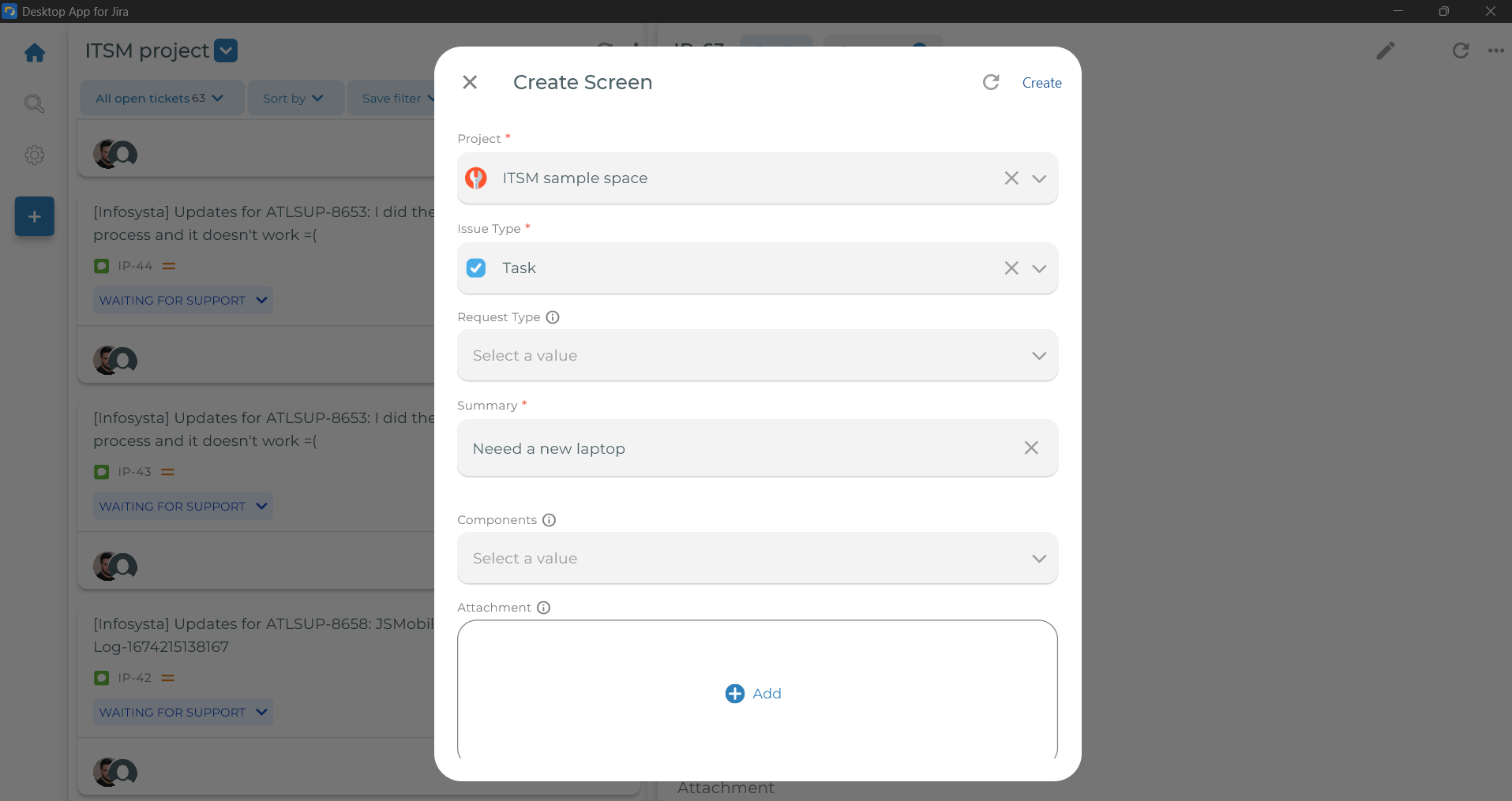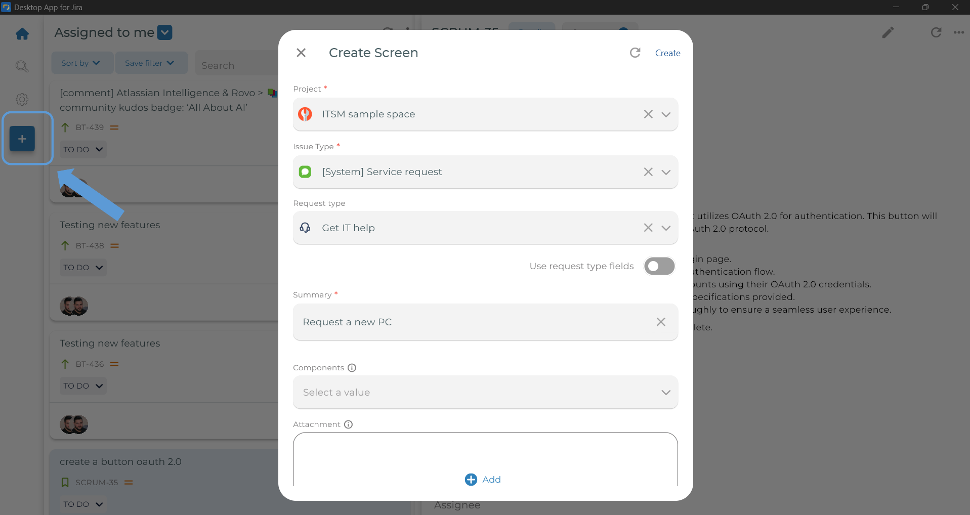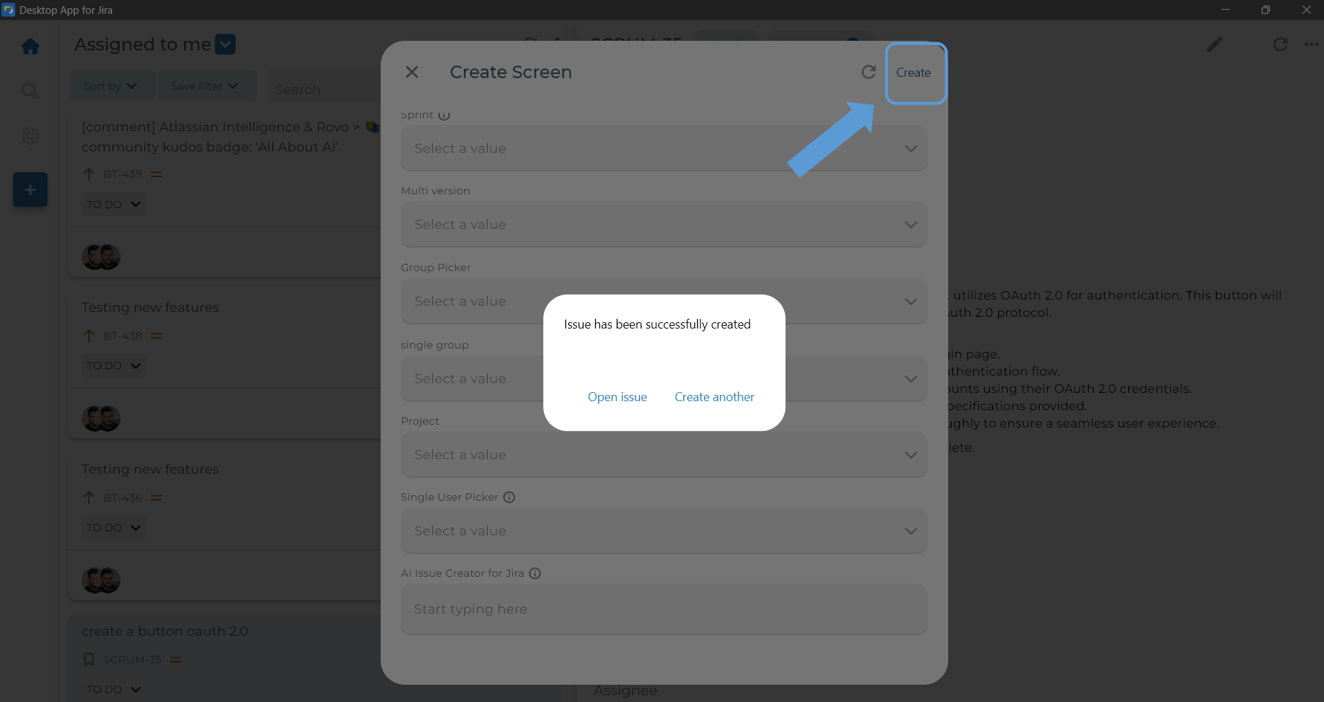Select the project and issue type, then fill in all required fields such as Summary and Description.