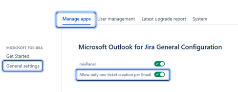 | 3 | On the left side menu, go to 'Microsoft Outlook for Jira'Â - OTJ app section |