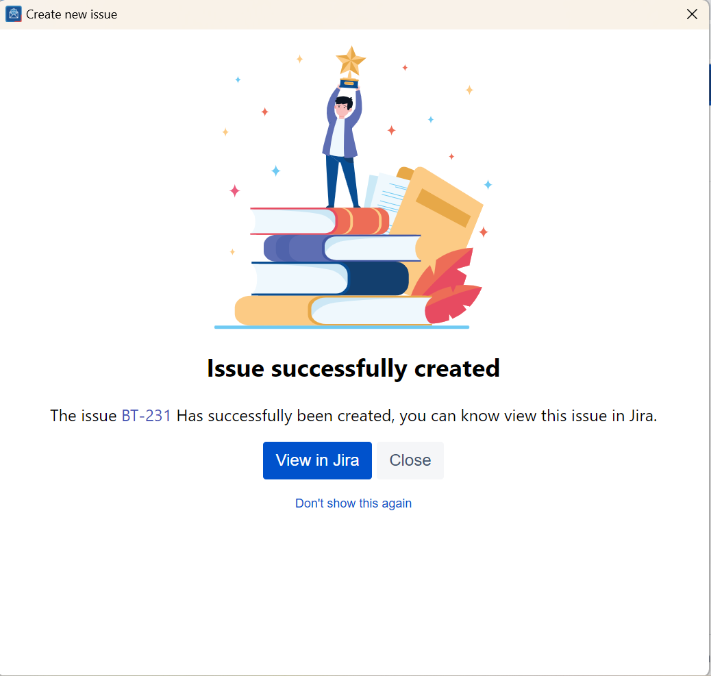 By default, the success page remains hidden, and instead, a pop-up window emerges when an issue is successfully generated. This pop-up conveniently includes a clickable issue number, allowing you to effortlessly access the issue in your web browser.